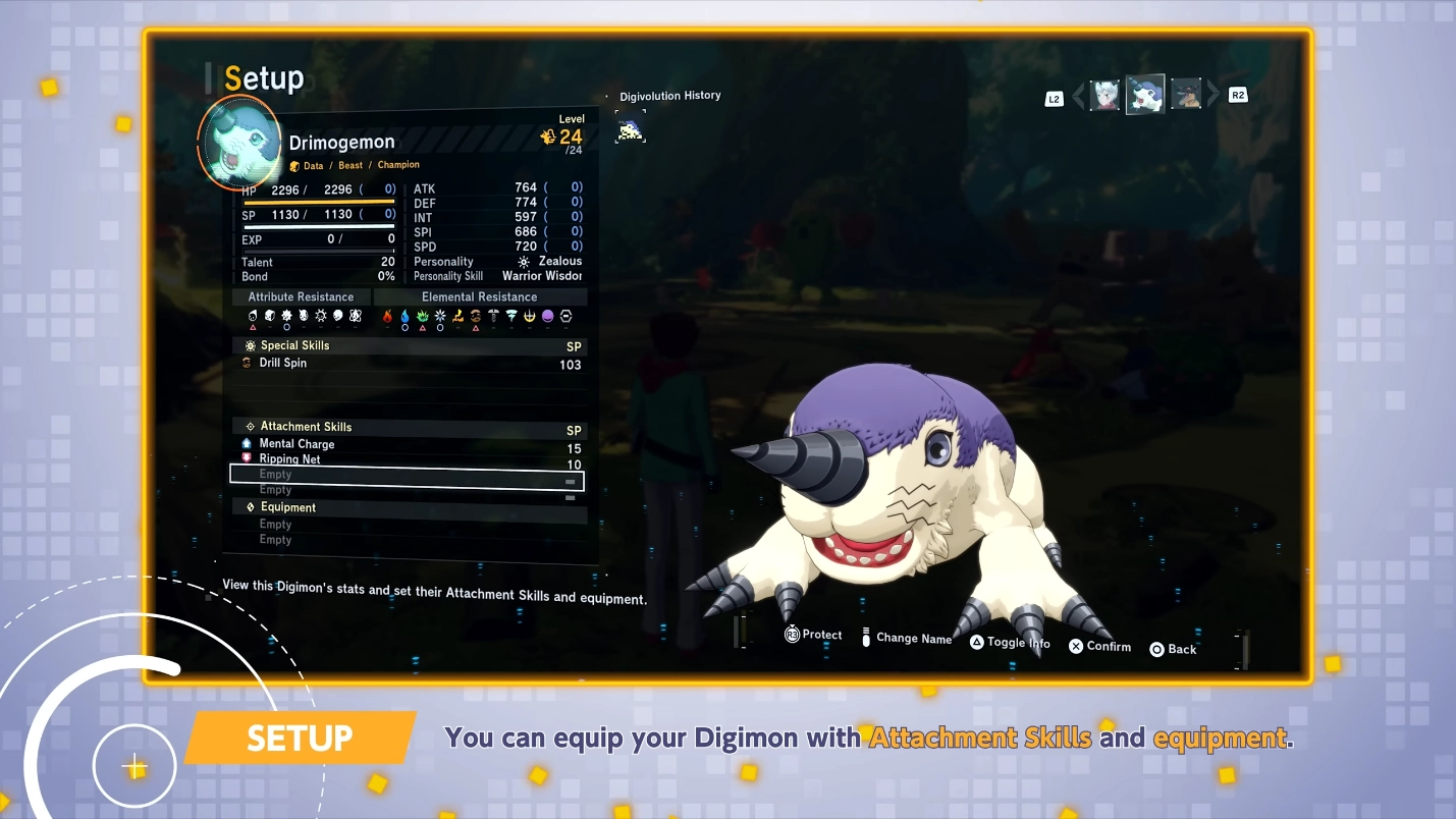 Once you have your Digimon, you can equip them with Attachment Skills and equipment.