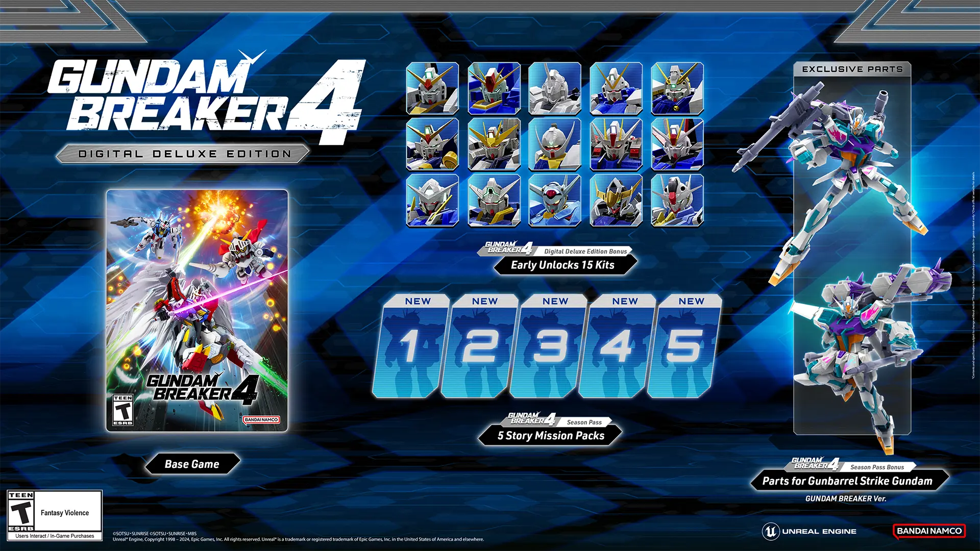 Digital Deluxe Edition – This version includes the base game, early unlocks to parts from 15 “hero” mobile suits spanning iconic series including Mobile Suit Gundam SEED, Mobile Suit Gundam: The Witch from Mercury, Mobile Suit Gundam: Iron Blooded Orphans, Turn A Gundam, Mobile Suit Gundam 00, Mobile Suit Gundam Unicorn, Mobile Suit Gundam Wing, and others. Also included are five story mission packs with new mobile suits and Digital Deluxe exclusive parts featuring the GUNDAM BREAKER 4 hero mobile suit and the Gunbarrel Strike Gundam (GUNDAM BREAKER Ver.).