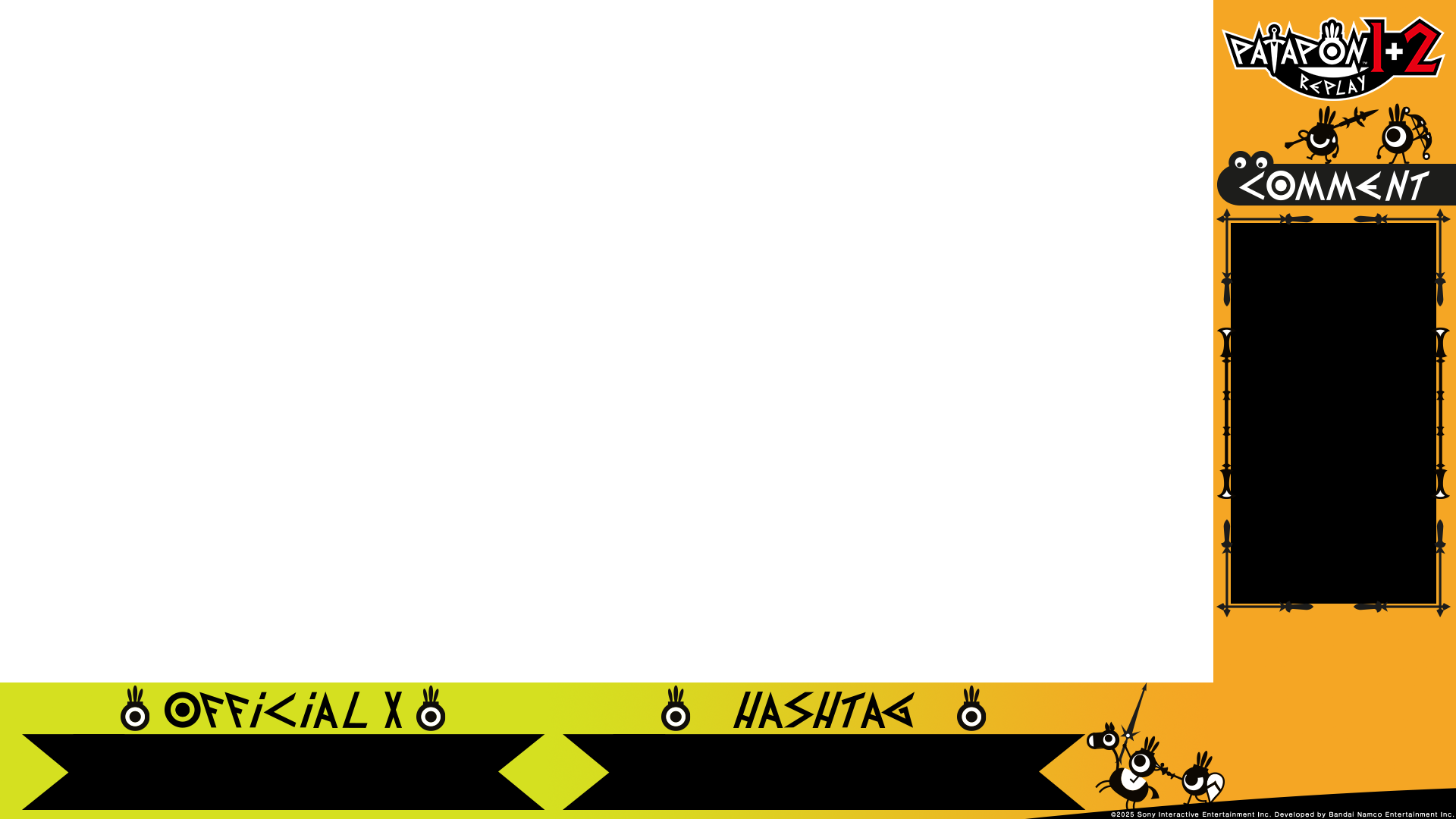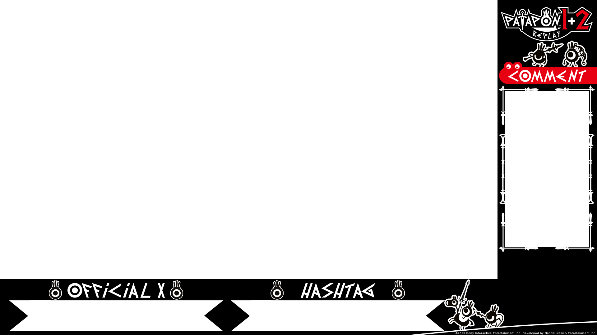 Bandai Namco Entertainment Inc. (hereinafter referred to as "the Company") hereby establishes the following terms and conditions (hereinafter referred to as "the Terms") regarding the use of game streaming assets (referring to various assets of "PATAPON 1+2 REPLAY" designated as distribution targets within this page, hereinafter referred to as "the Assets") in connection with "PATAPON 1+2 REPLAY" (hereinafter referred to as "the Service"). Users (hereinafter referred to as "Users") who utilize the Assets are requested to read the following carefully and agree to the Terms before use. By downloading the Assets, Users are deemed to have agreed to the Terms. If you do not agree to the Terms, please discontinue use.
