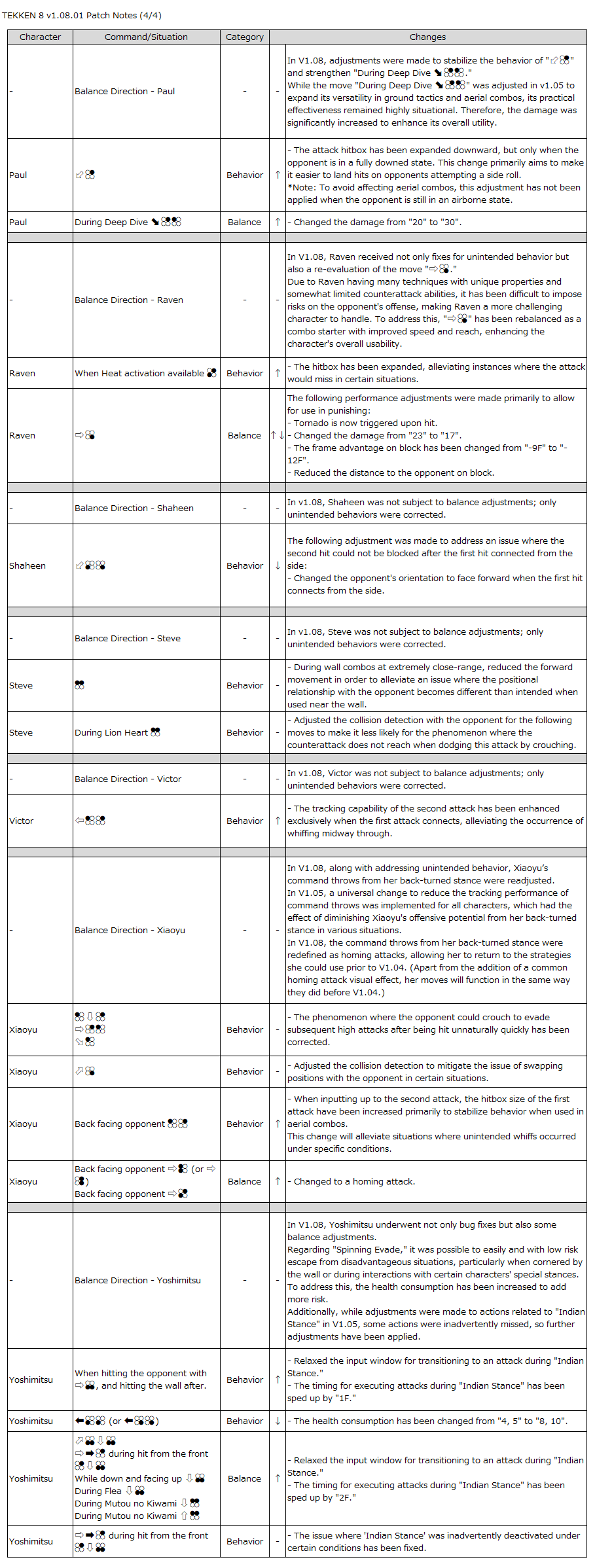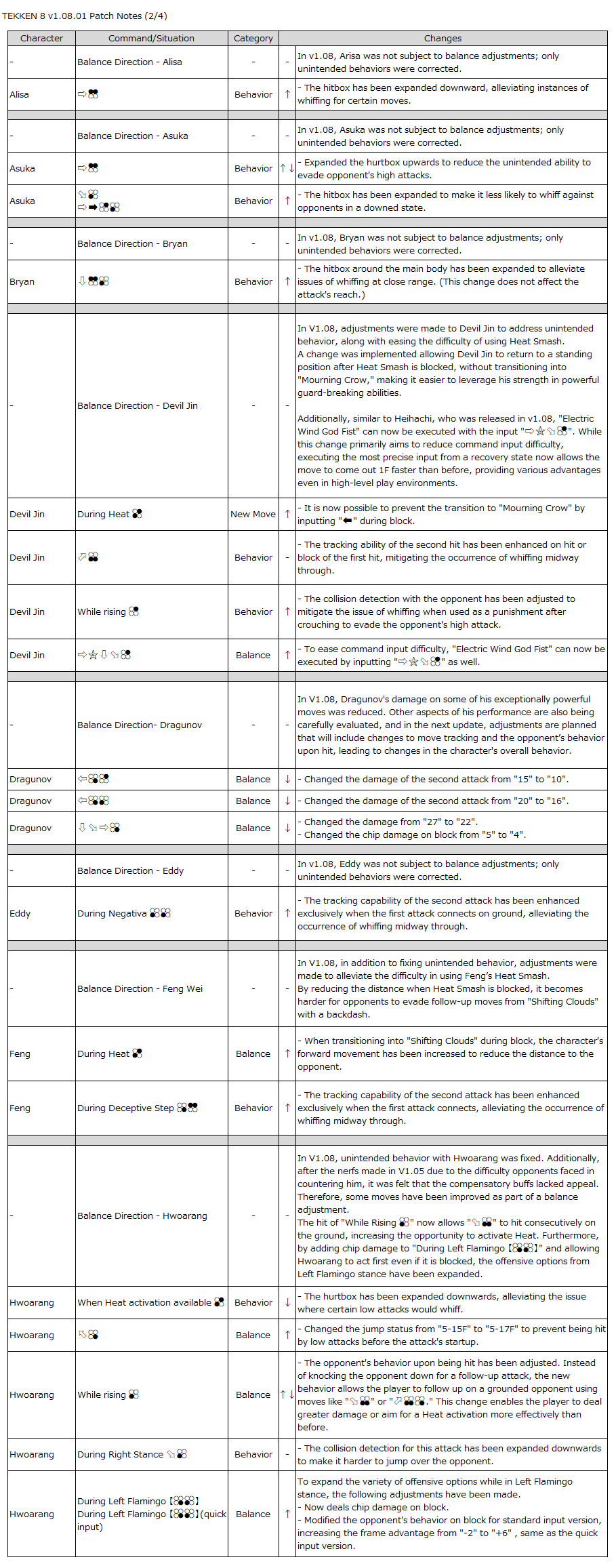- In the upcoming v1.09 update, we are considering adjustments that will affect the behavior of certain characters (such as Dragunov and Alisa), including changes to the tracking performance of their attacks and the reaction of opponents when hit.
