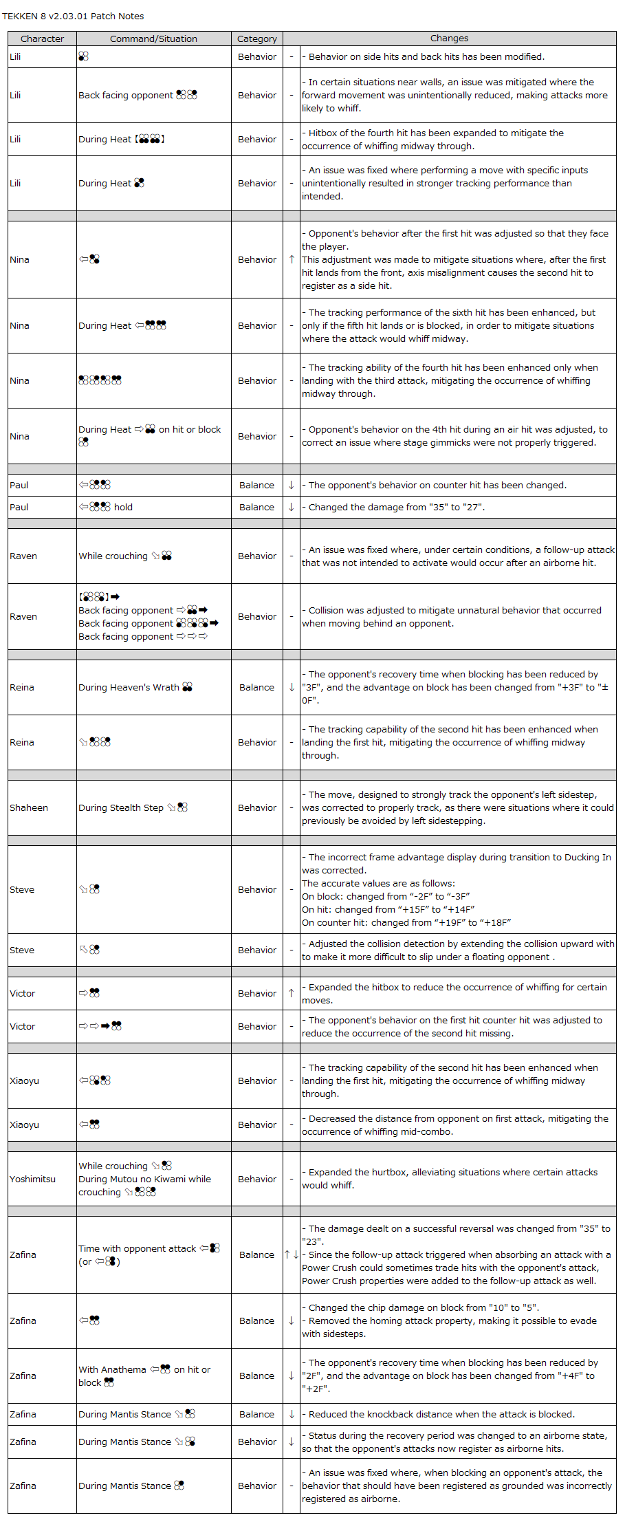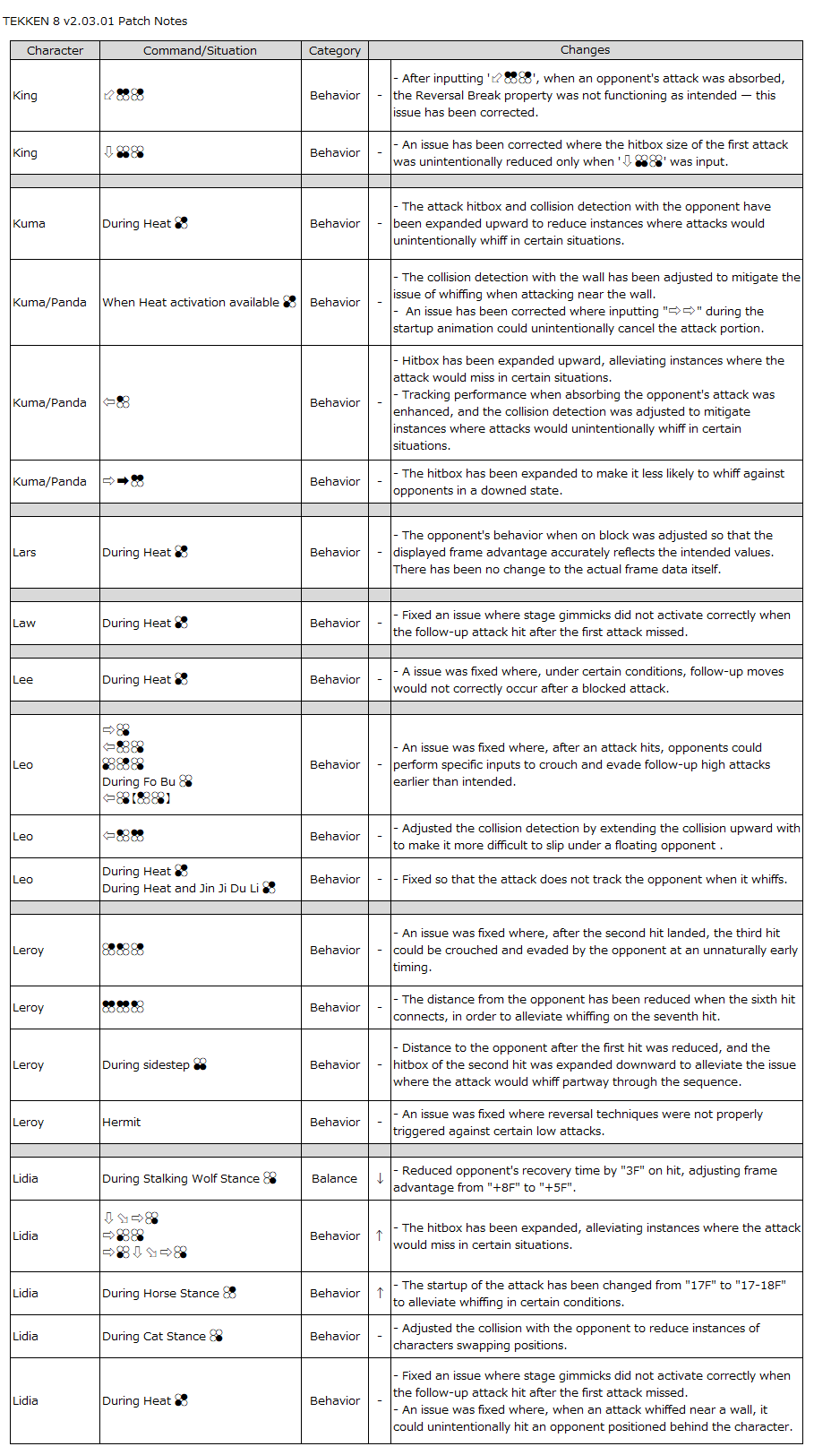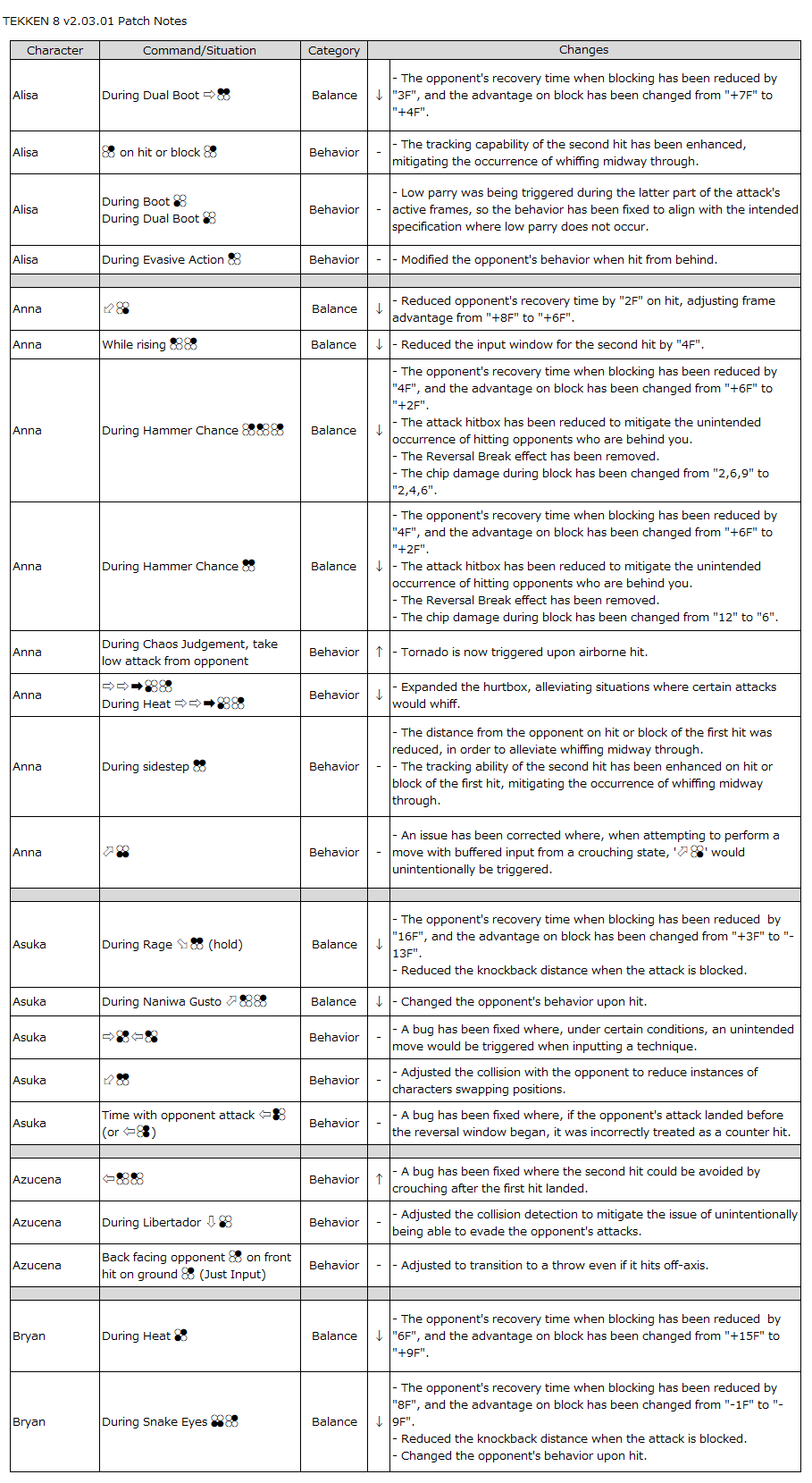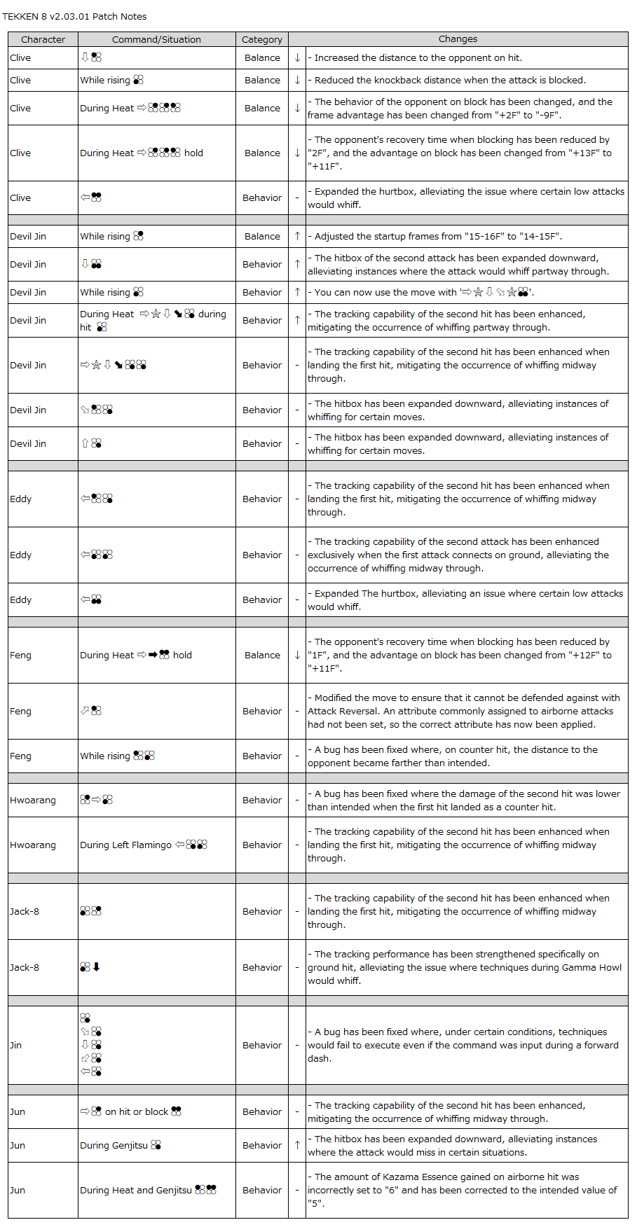 In TEKKEN 8 Ver.2.03.01, we have implemented further balance adjustments to continue improving the battle environment. This update includes ongoing adjustments to moves that offer excessively high rewards and also introduces changes to Rage Arts.