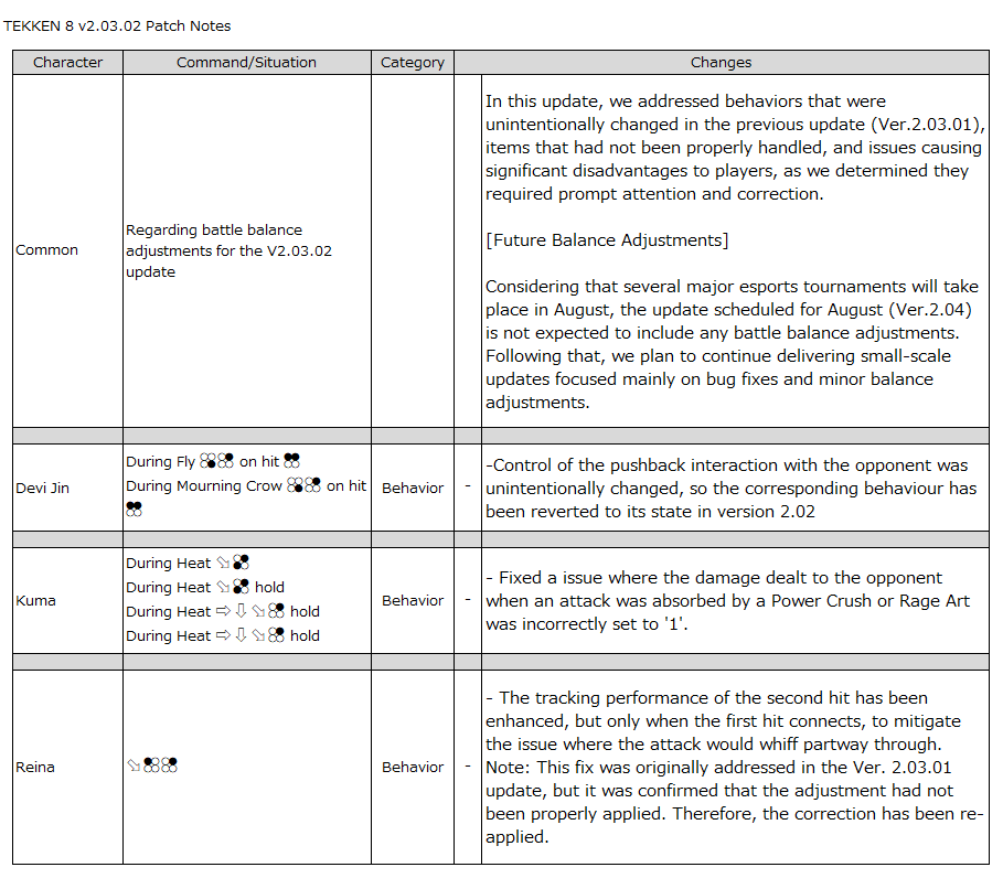 We have corrected unintended behavior changes introduced in the previous update (Ver.2.03.01), issues that were insufficiently addressed, and bugs that were causing significant disadvantages to players, based on the judgment that early response was necessary.