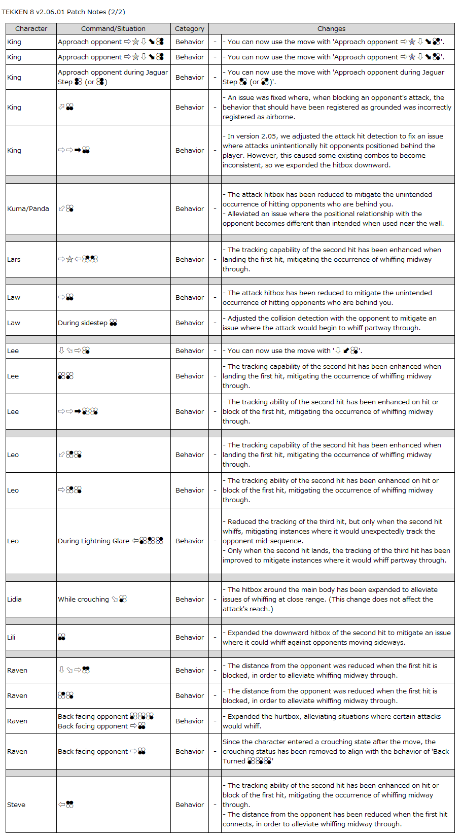 Some moves that had their command inputs changed in Version 2.00 can now also be executed using their old command inputs. This change applies only to King and Lee, as no moves were assigned to those old inputs for them.Thank you for your continued support of TEKKEN 8.
